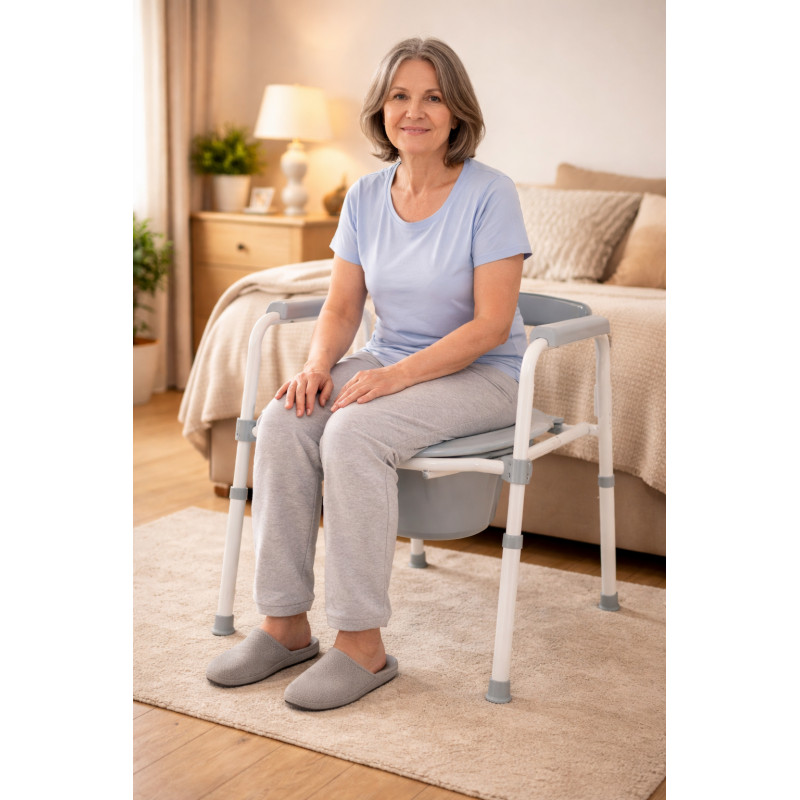 Equipado com apoios de braço para suporte e um encosto. O todo se dobra plano. Vem com bacio com tampa removível na parte de trás. Equipado com um guia para posicioná-lo acima da sanita.